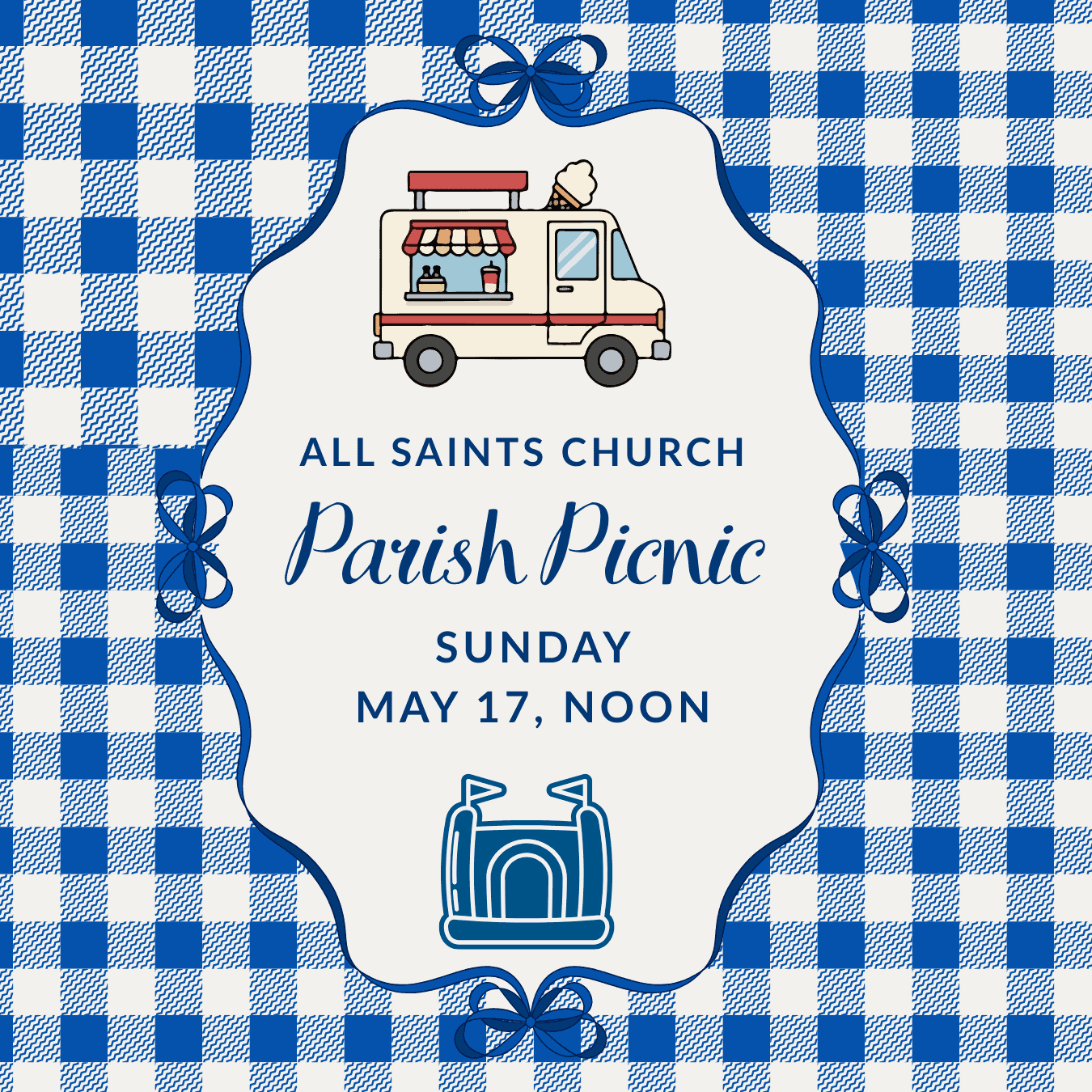 Join us for our All-Parish Picnic as we celebrate the close of another wonderful program year together. Enjoy a relaxed afternoon with barbeque, bounce houses for the kids, and an ice cream truck. This is a joyful opportunity to gather as a church family, reconnect, and show gratitude to our volunteers whose generosity and dedication make our shared life possible. Whether you have been at All Saints for years or it is your first Sunday, you are welcome! Invite a friend and come ready for good food and great company.